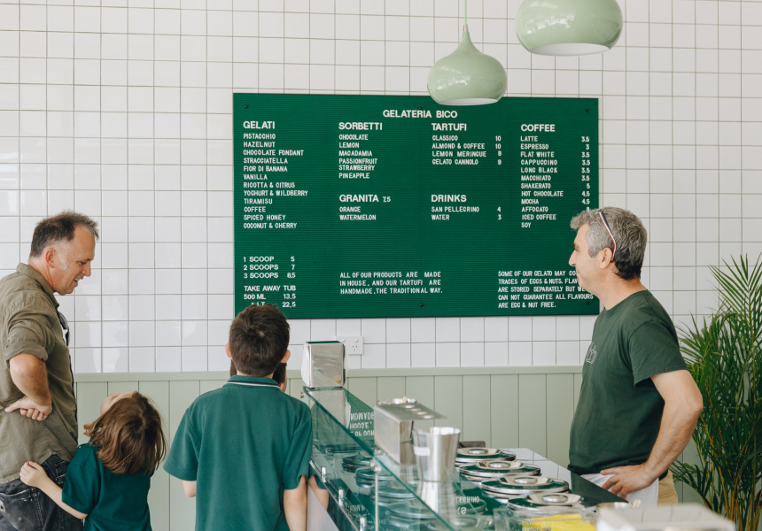 That same from-scratch mantra translates to the gelateria’s interior. Sea-foam green panelled timber gives way to rows of square, white subway-style tiles, and green pendant lights hover above. A polished concrete bench encases the pozzetti (traditional gelato containers).
